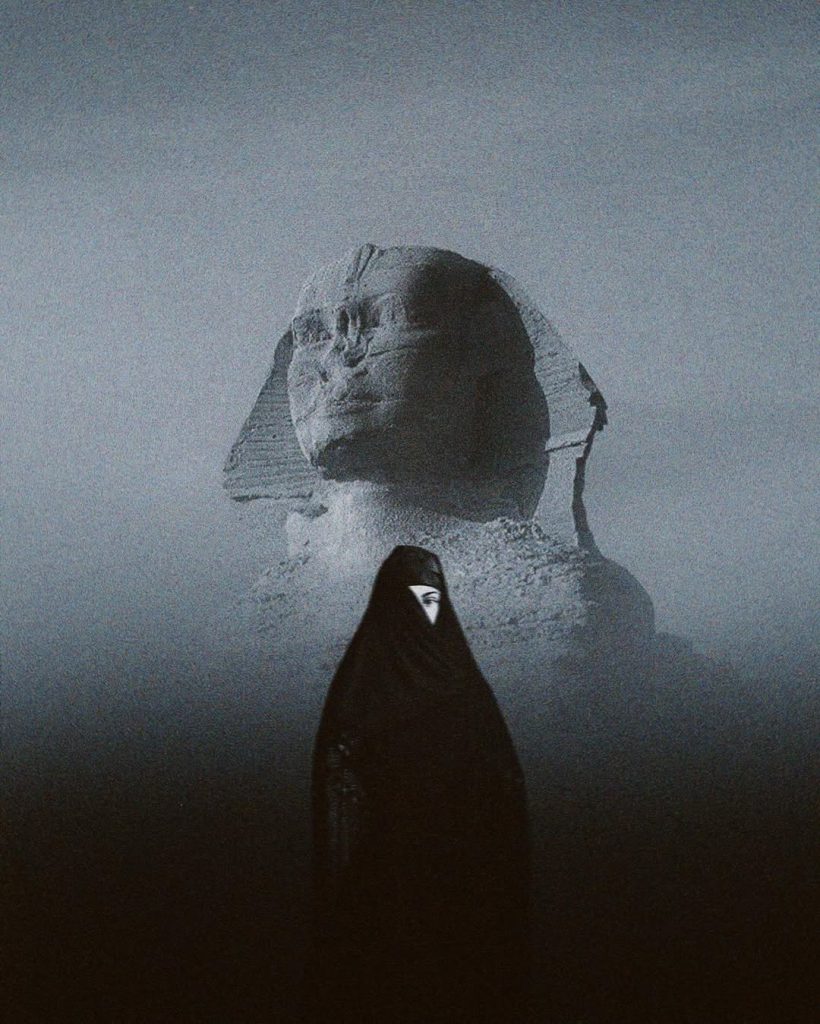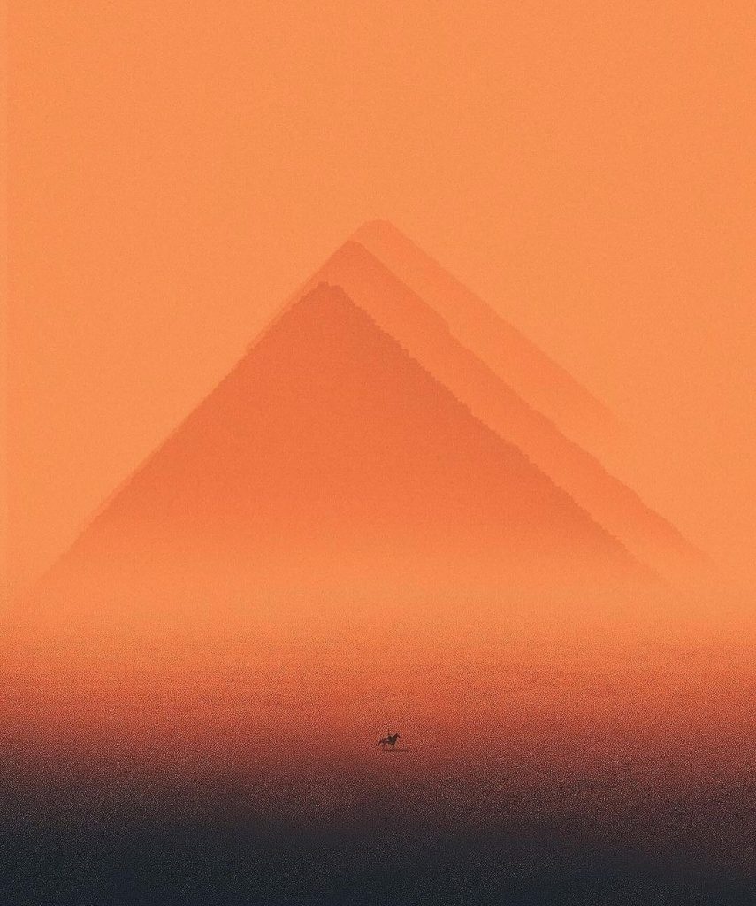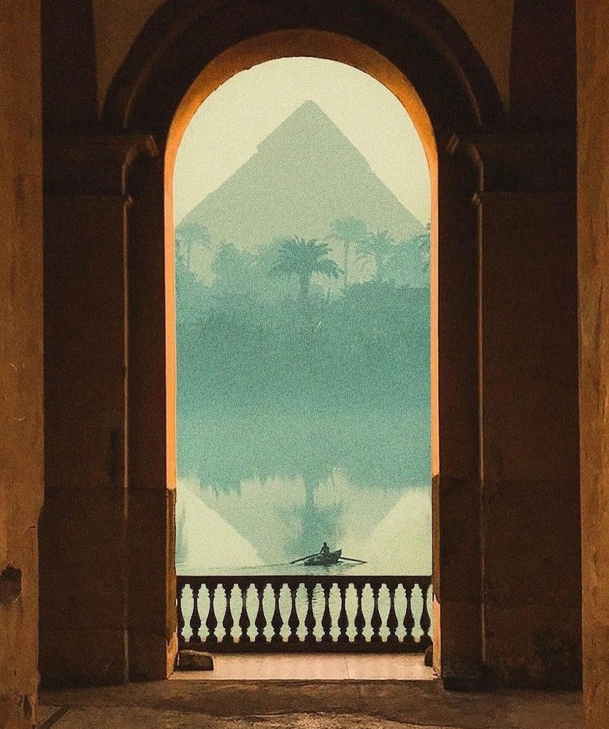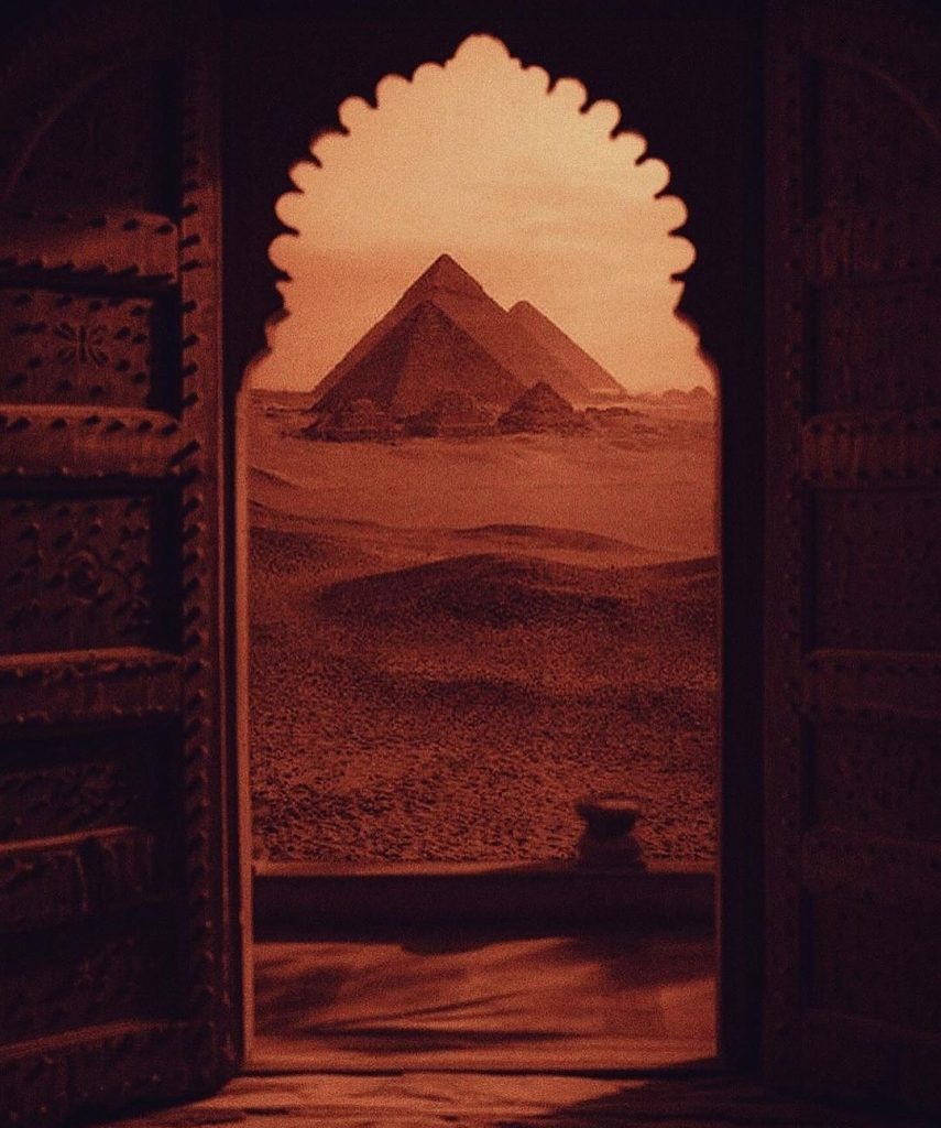 À travers une porte finement sculptée de motifs traditionnels égyptiens, le regard s’évade vers l’immensité des dunes dorées du désert. La lumière du soleil couchant enveloppe le paysage d’une chaleur dorée, accentuant les ondulations délicates du sable. Au loin, les pyramides se dressent avec une majesté intemporelle, semblant flotter entre réalité et mirage, témoins silencieux d’une histoire millénaire. Chaque détail, de l’ombre fraîche du cadre sculpté au scintillement du sable sous la lumière, crée une atmosphère presque mystique, suspendue entre le tangible et le rêve. L’image invite à un voyage sensoriel où la sérénité et le mystère coexistent, offrant un contraste saisissant entre le premier plan ombragé et l’éclat chaud du désert à l’horizon.
