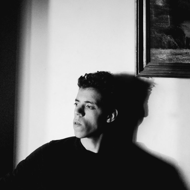 Une arche massive ouvre sur un paysage improbable : une pyramide se reflétant dans un lac calme entouré de palmiers. Au centre, un homme dans une barque glisse paisiblement sur l’eau. L’ensemble crée une scène poétique mêlant architecture monumentale et nature luxuriante, presque comme un rêve suspendu dans le temps.